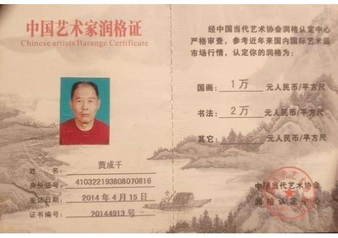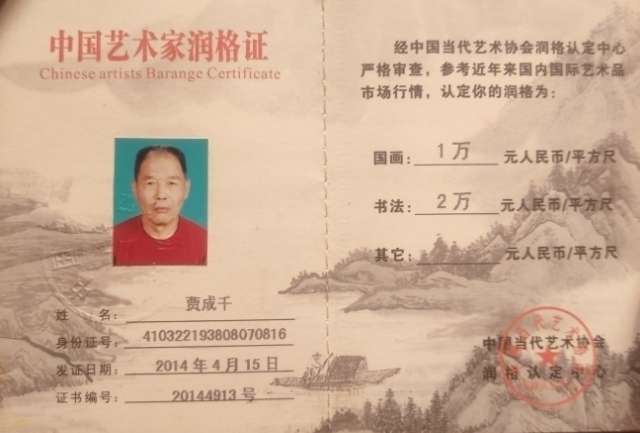 贾成千1938年生,毕业于首都师范大学中文系,现任中国国画家协会理事。兼任北京晚晴书画院和台北故宫书画院名誉院长,客座教授,荣誉终身任期。在全国举办的各类书画大展赛中,获得金银铜各种奖励一百余次。被电视台及各种版本和典籍收录、编辑100余次。2007年,被中国国画家协会和中国书画报社联合评为“中国百杰书画家”,其代表作品由国家邮政部门多次印制成名信片、邮票和各种有价证券,发行全国!2011年5月,被国际文化艺术协会、中华世纪坛——世界艺术馆、全球华人艺术家协会三家联合评为“中国最具潜力艺术家”。早在2002年作品就通过“国家人事部”的“ISQ9000A“资质认证和“ISE”评审价值,被授予“知名国画家”称号。作品被《石渠宝笈》首卷上册收录。 某知名拍卖公司很想与我合作,我拒绝。他们说,即是流拍,我们也给你做成交记录!开拓你的市场,提高你的画价!我说,骗得所有人,总骗不得自己!我以我的山水画能进入寻常百姓家为荣,我以河南入住博宝艺术网99位书画家我排第一而自豪!因为我价廉,销售数量在河南位居榜首,能使喜欢我山水画的人买得起,我乐! 2014年6月,由中国当代艺术协会主办,中国诗书画出版社出版了个人画集——《中国传奇人物——山水画家贾成千》。书号 ISBN 987-7-988-16531-0. 2014年8月,人民美术出版社编辑出版的《中国书画名家精品》邀请我入编艺术简介和多幅山水画作品,本书共收录书画名家26人,其中还有画家吴冠中、贾浩义、卢禹舜、贾又福、何家英、刘大为、冯远、黄永玉、沈学仁、霍春阳等十八人,书法家欧阳中石、沈鹏、赵善坤、李铎等七人。