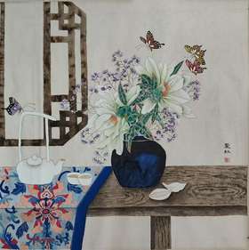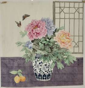 艺术家自销 亓夏红 没骨牡丹与青花瓷