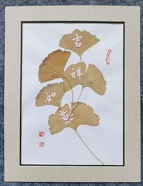 艺术家自销 黄克 银杏树叶交叉贴画,凸字书写吉祥如意并钩红边。