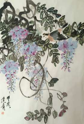 湖北美院国画系 教师,青年潜力 张廷青 《紫藤小鸟》