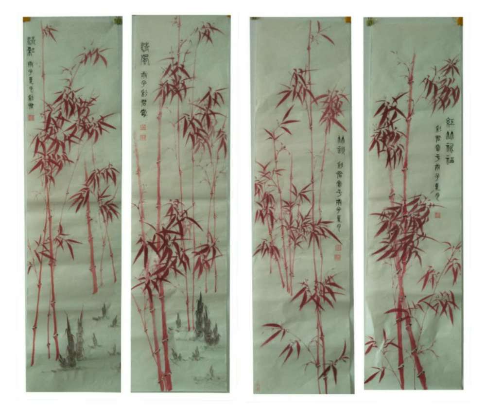 艺术家自销 范彩君 山东德州美协会员,红竹祈福四条屏