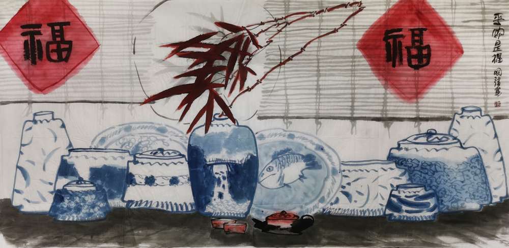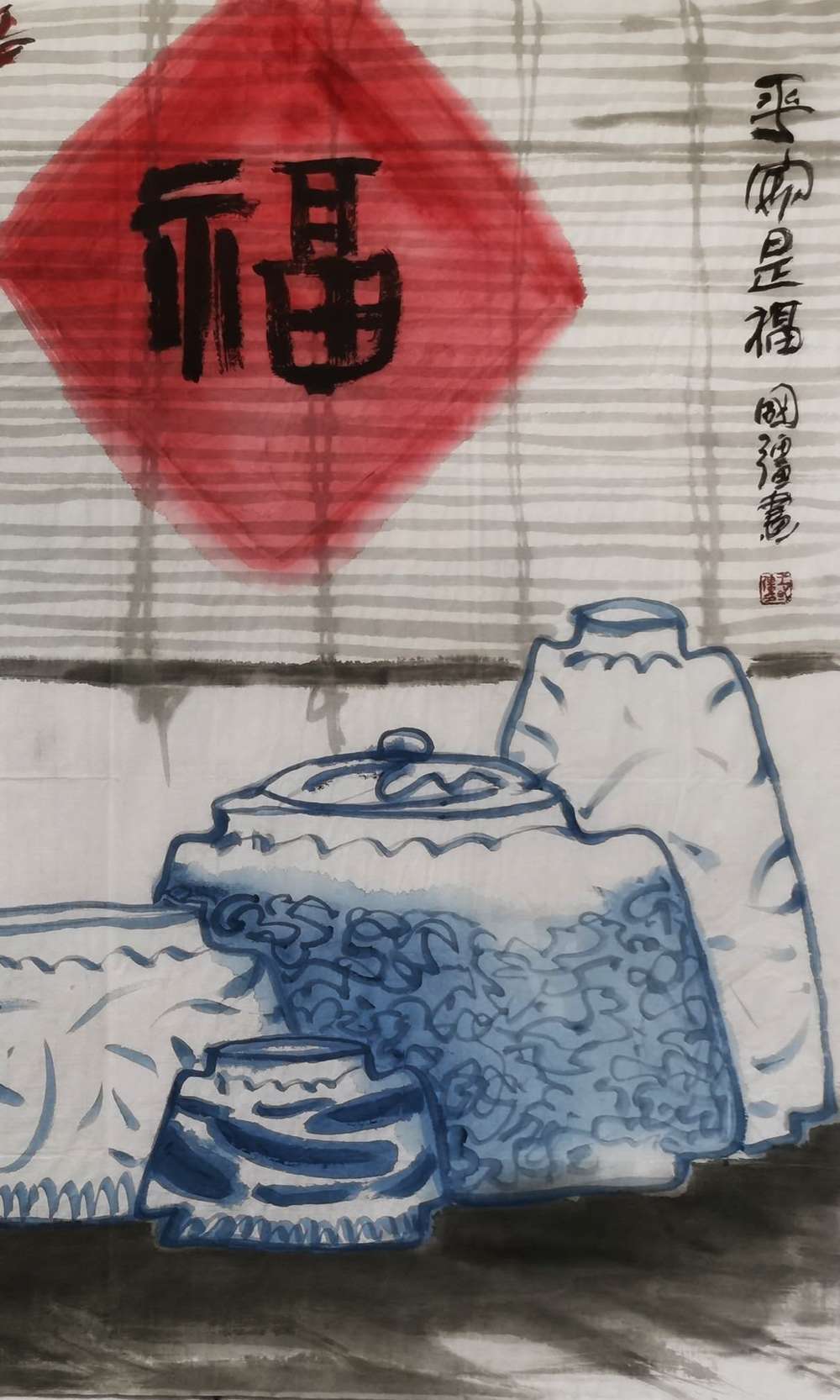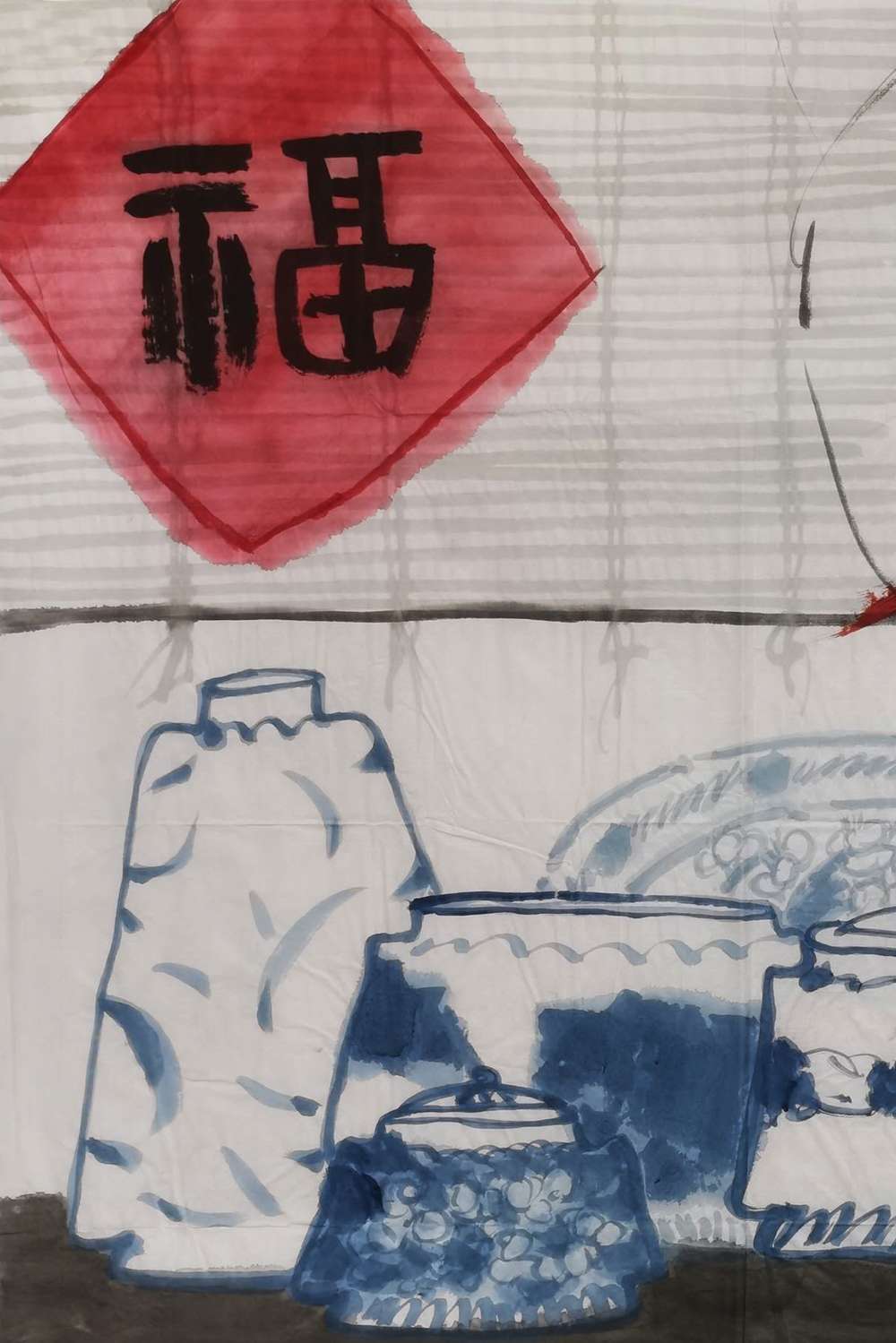 作品通过对青花瓷花瓶的绘画,青花瓷花瓶寓意平平安安,画面画了两个福字,寓意双福临门。