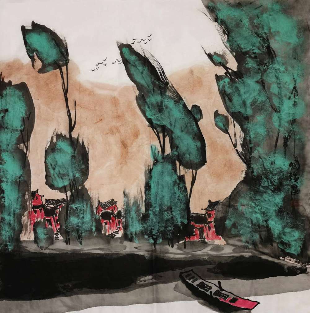 这幅作品描绘的是几棵村边的柳树,在晚风的吹动下,显露出婀娜多姿。很是迷人。
