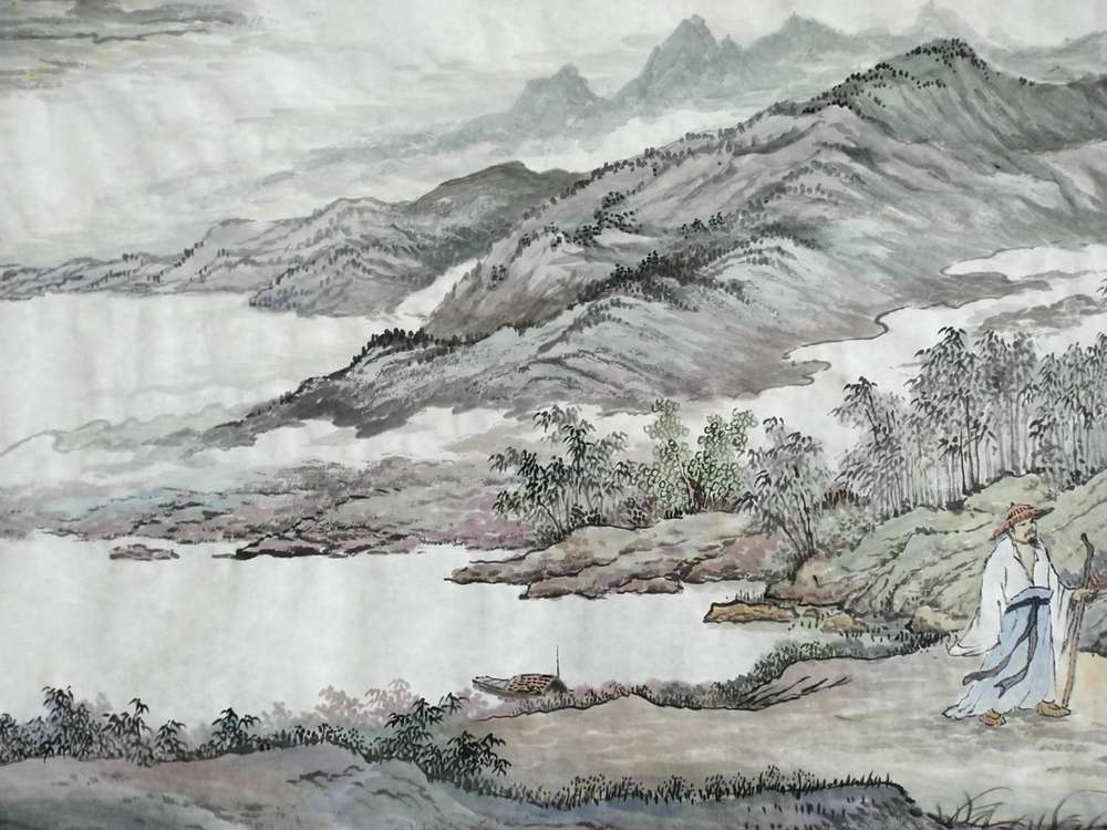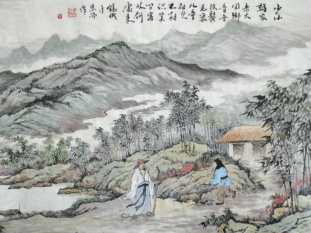 作品以贺知章诗意创作完成,作品意境高古,诗意情节形象化,构成一幅优美的山水画。