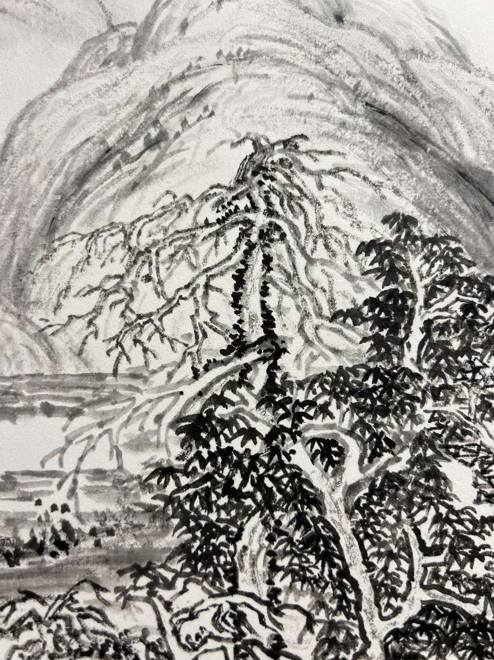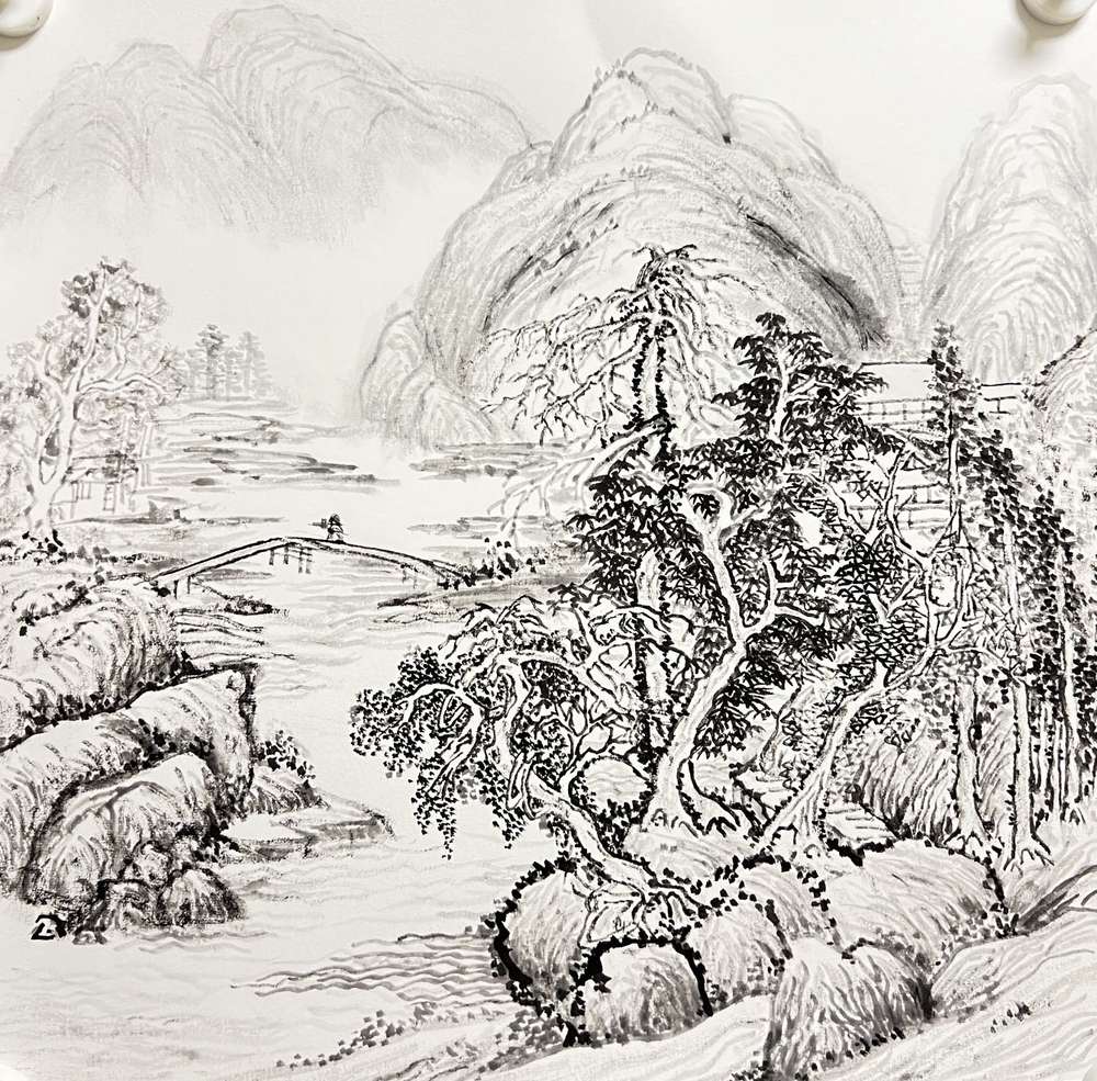 作品用简洁的笔法描绘了山林,树木,桥梁等以古法用比气韵生动