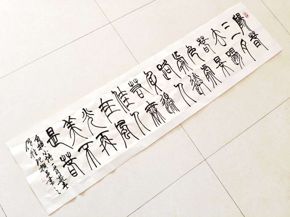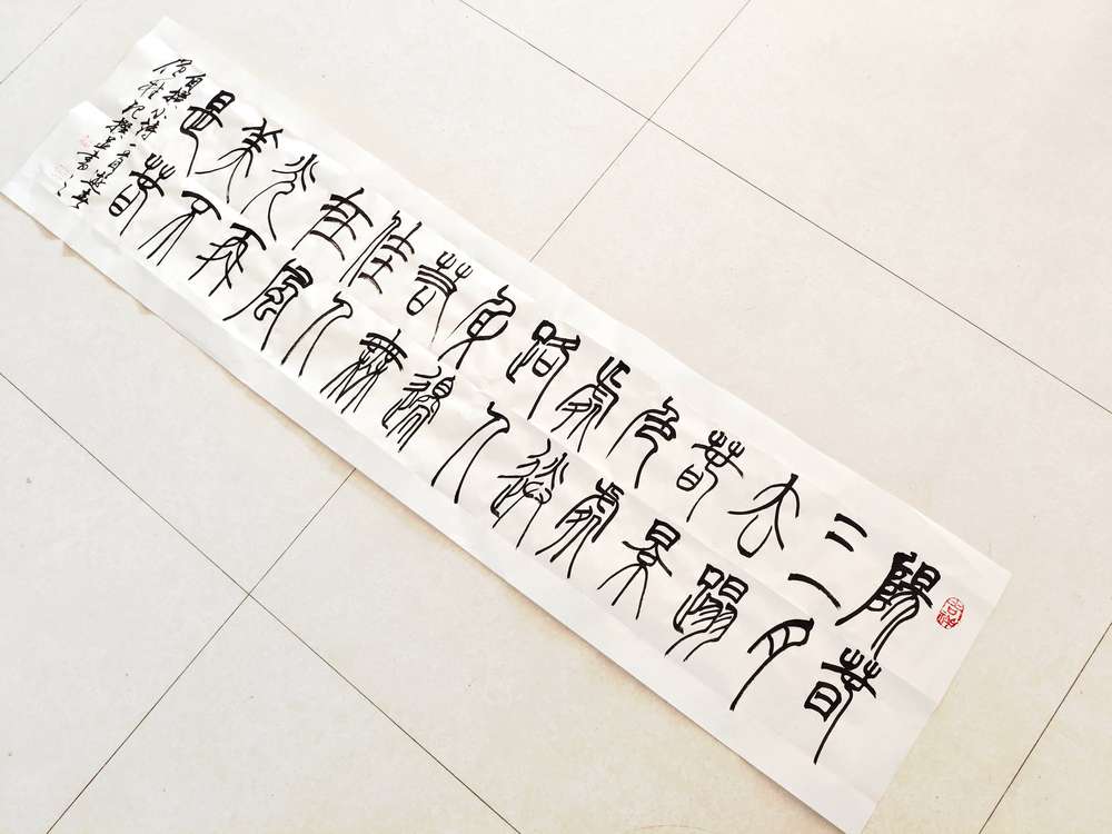 自撰小诗篆书创作《游春》 作品释文: 阳春三月去踏春,景色处处迷路人。 身边若无佳人在,风光再美不是春。 作品未装裱。