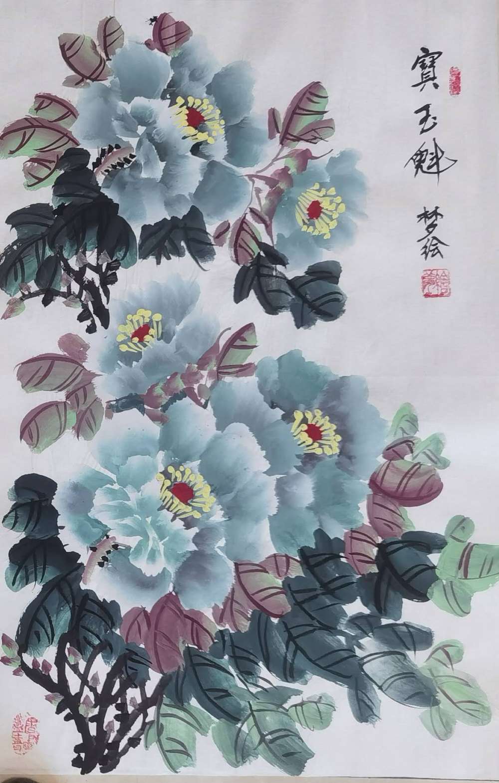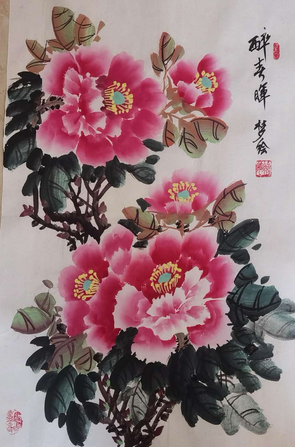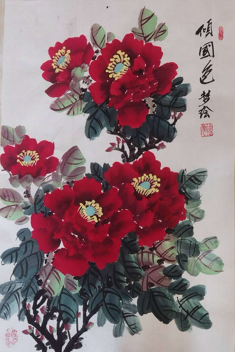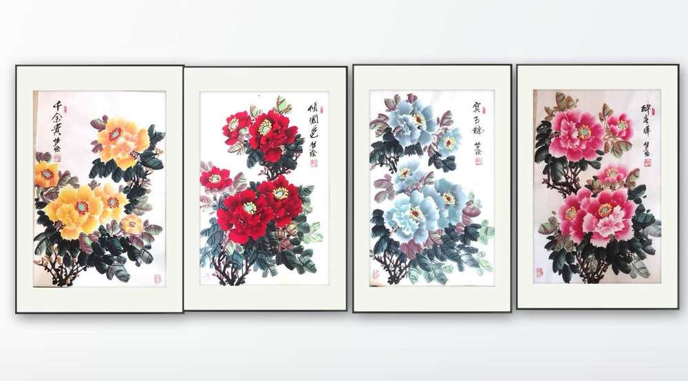 艺术家自销 梦绘 四条屏《红黄蓝粉牡丹》