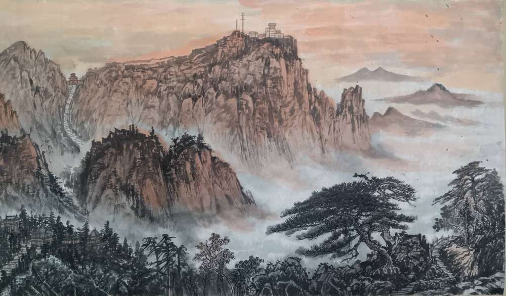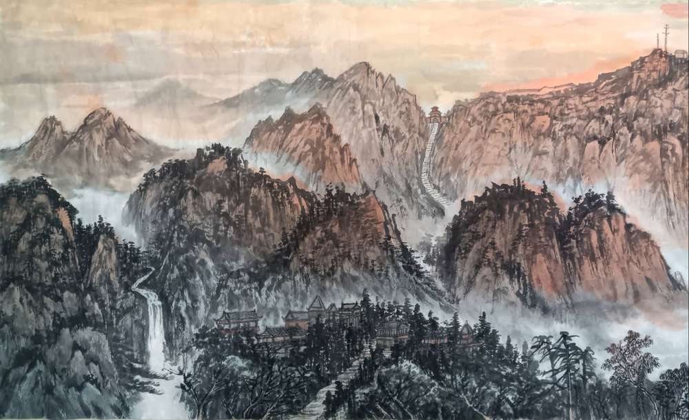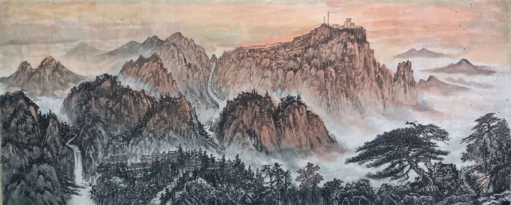 尺寸180*72,未落款,可根据需要落款。画面构图遵循传统山水“高远”法,近、中、远山层叠有序,通过墨色浓淡与线条疏密,清晰构建出空间纵深感,山势的雄浑与延绵感突出。墨色运用兼具层次与韵律,干、湿墨结合表现出山石肌理与云雾氤氲之态;设色上,山顶的暖色调与整体水墨冷调形成微妙对比,既点明“朝日”的光影氛围,又未破坏水墨本体的清雅感。线条以“披麻皴”“斧劈皴”结合,刚柔并济,既强化了山石的质感。