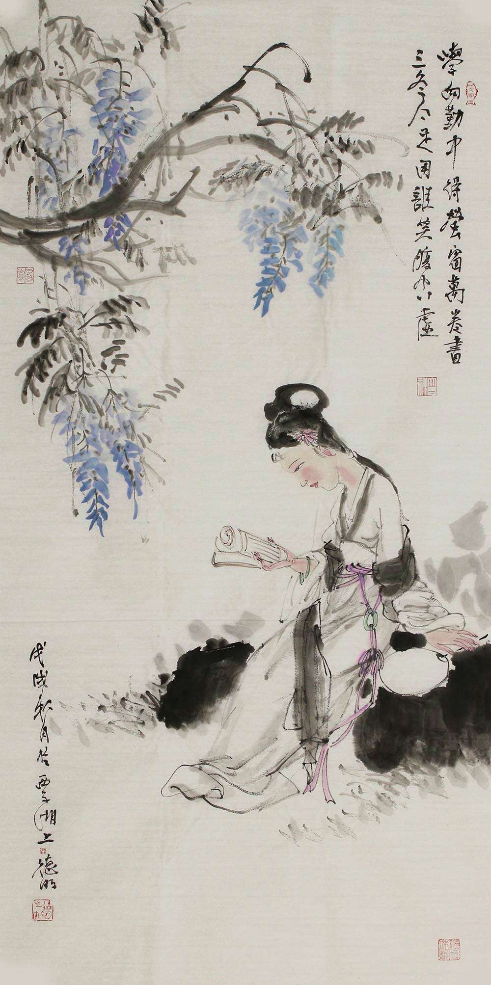 刘德明先生的工笔人物画作,其画作在笔法和技巧上传承了中国工笔画人物绘画的传统,中锋用笔、笔墨严谨,追求用笔生动、渲染层次丰富、形象细腻逼真。