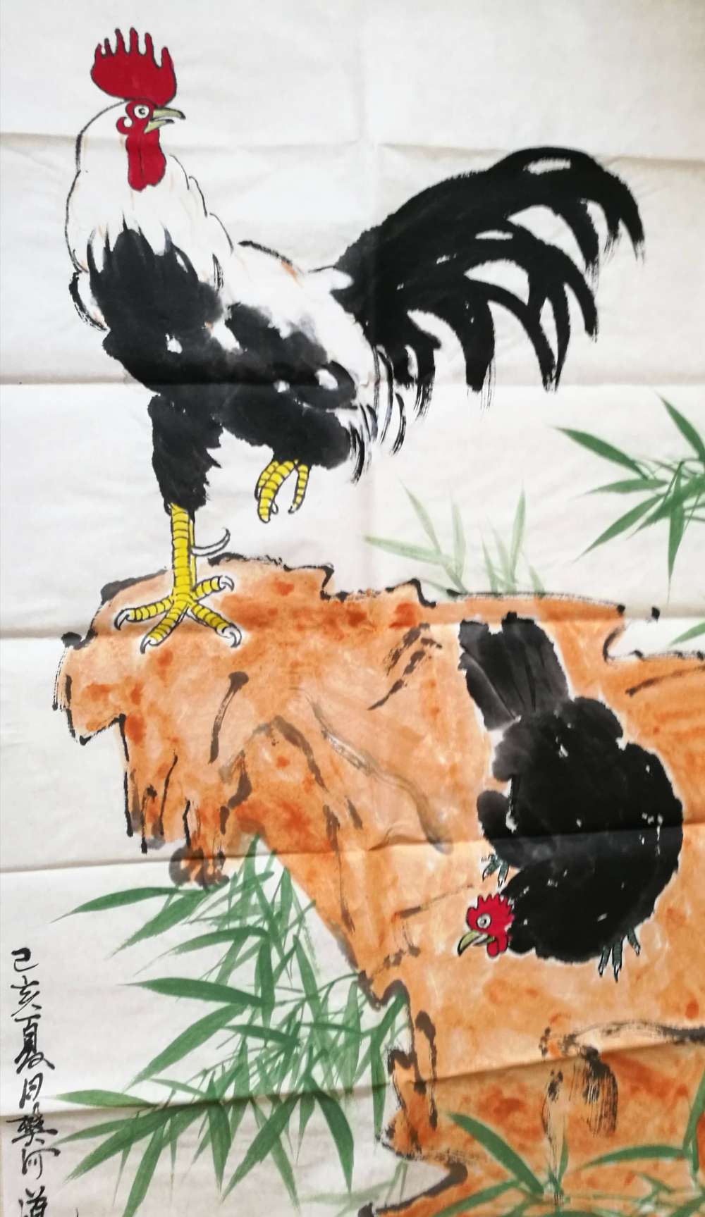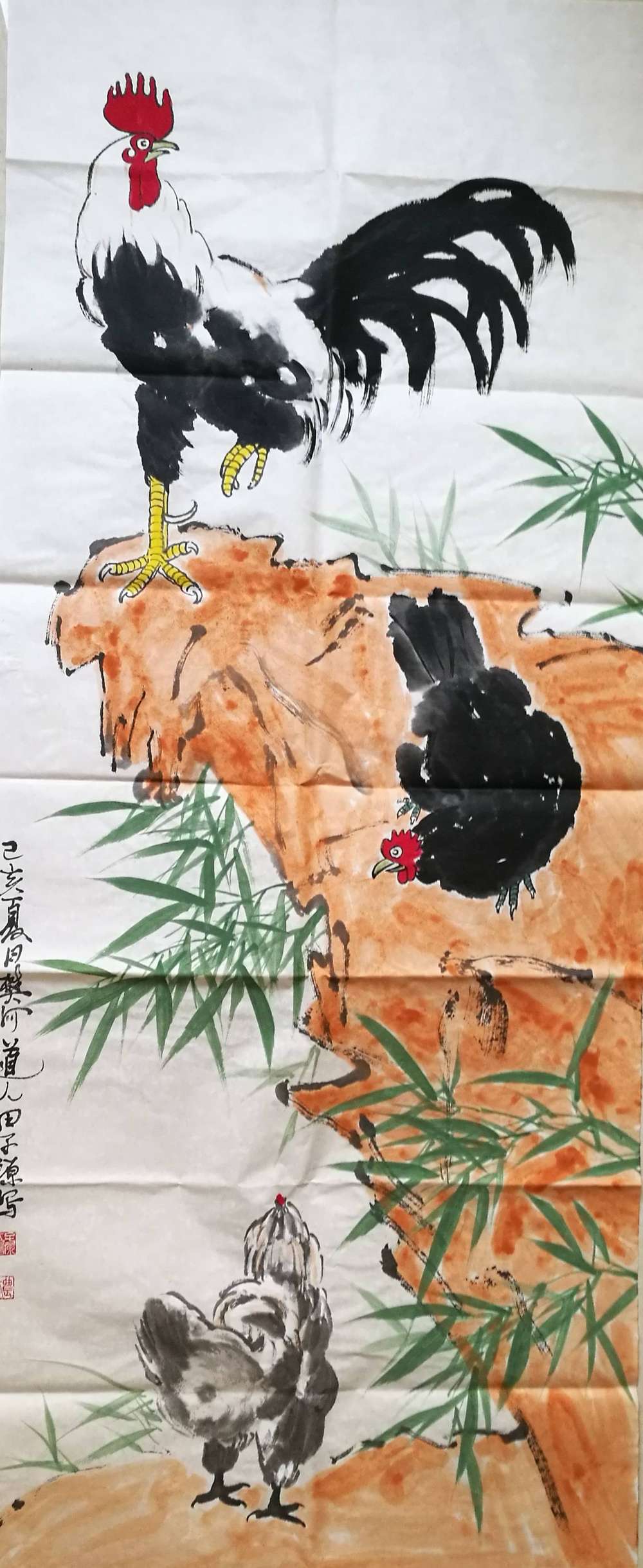 雄鸡遥看远方,两只母鸡相望,合谐一家