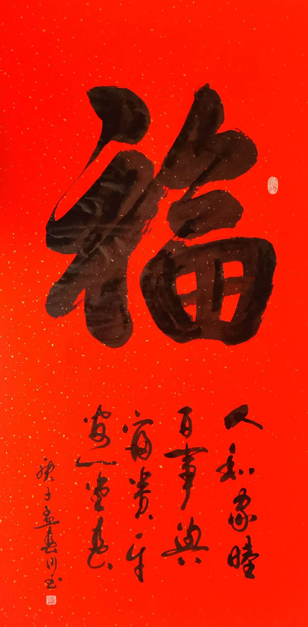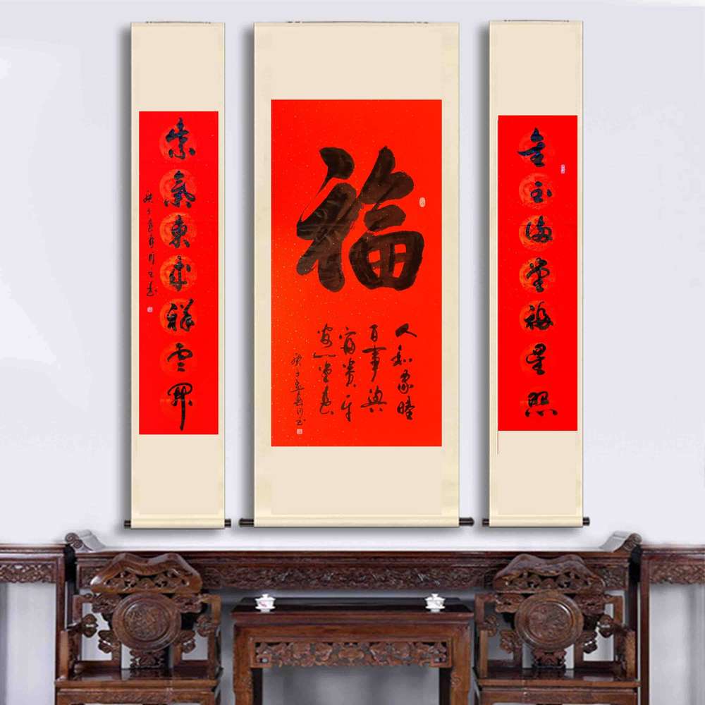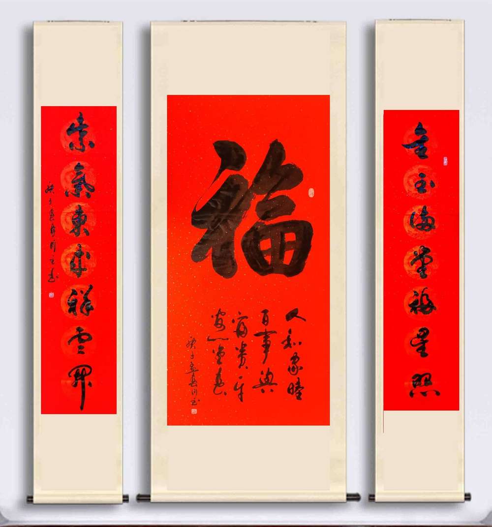 042604四尺中堂《福》(万年红洒金宣纸和瓦当对联纸)【特别提示】1.2图为装裱、悬挂示意图。平台价格不等于作品润格。文字内容:人和家睦百事兴,富平安一堂春。对联内容:金玉满堂福星照,紫气东来祥云开。