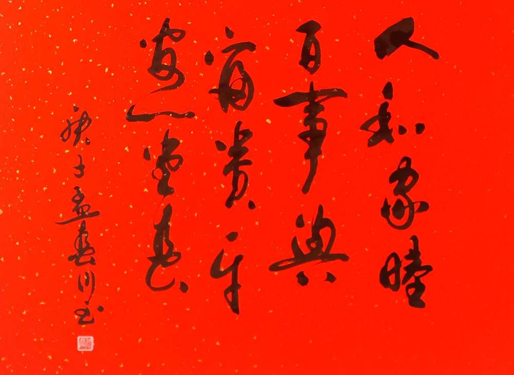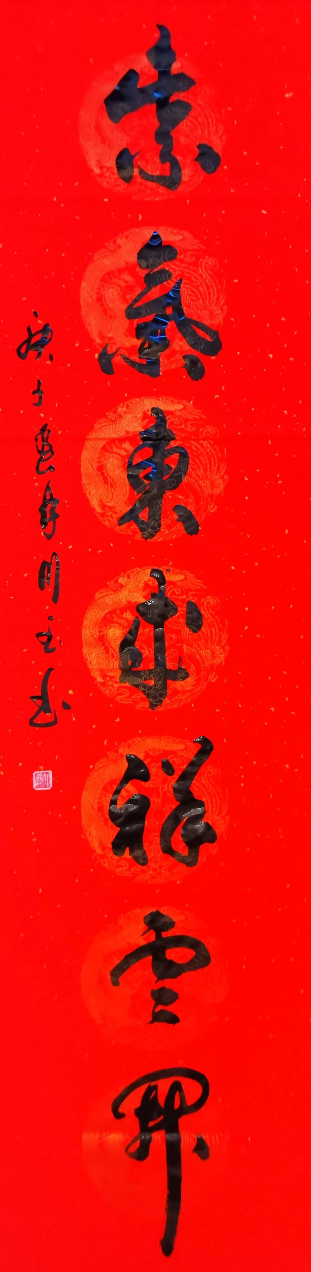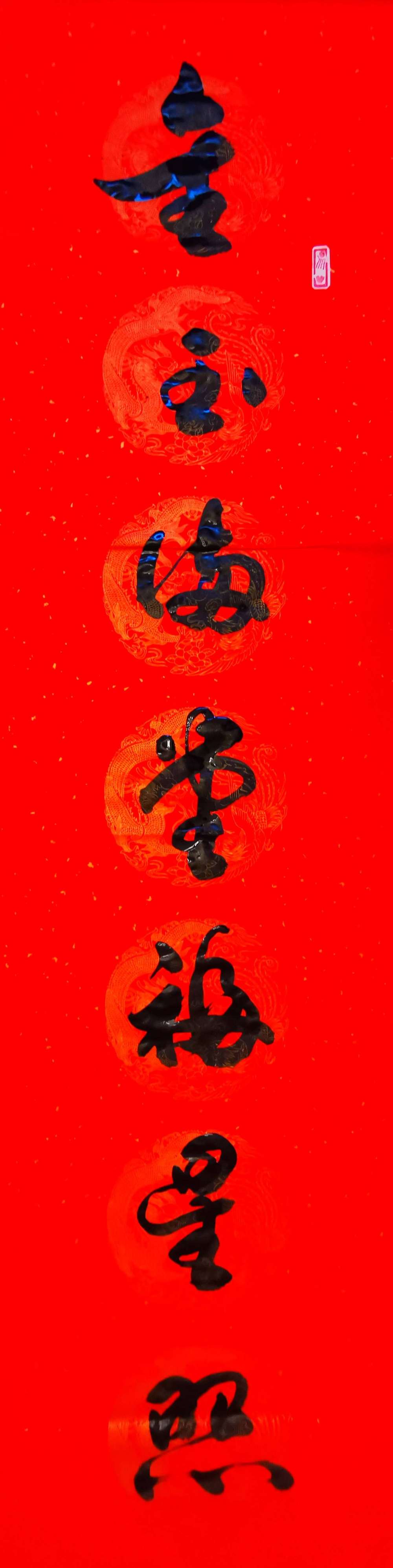042604四尺中堂《福》(万年红洒金宣纸和瓦当对联纸)【特别提示】1.2图为装裱、悬挂示意图。平台价格不等于作品润格。文字内容:人和家睦百事兴,富平安一堂春。对联内容:金玉满堂福星照,紫气东来祥云开。