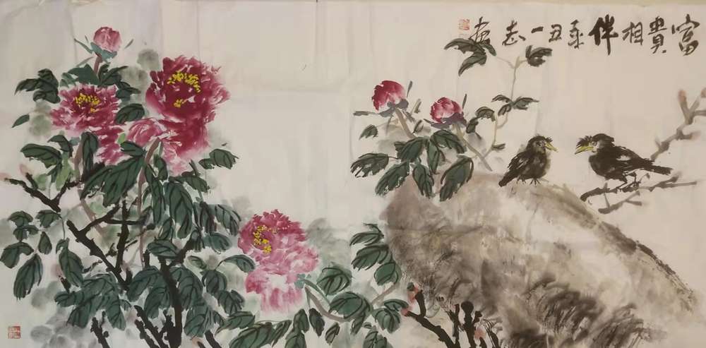 胭脂牡丹大富贵,石头坚实运长久,双鸟依依情意浓。