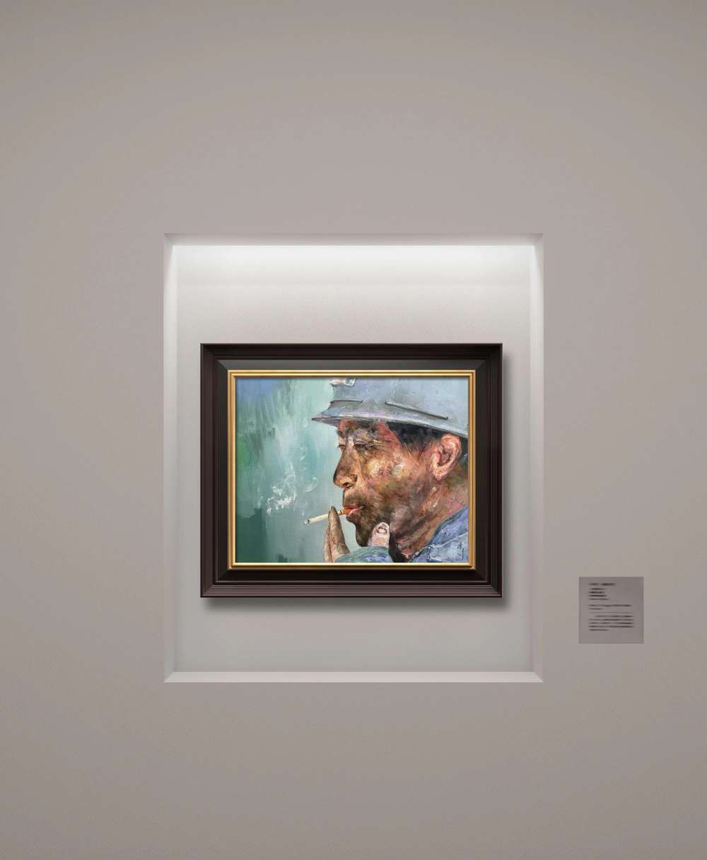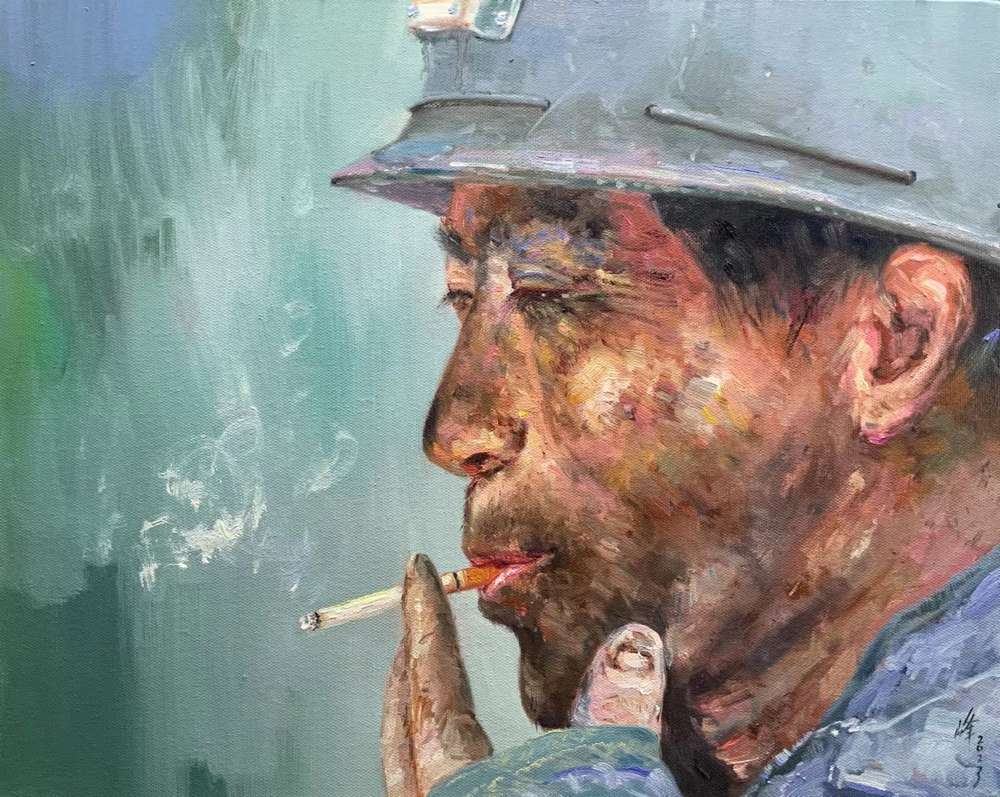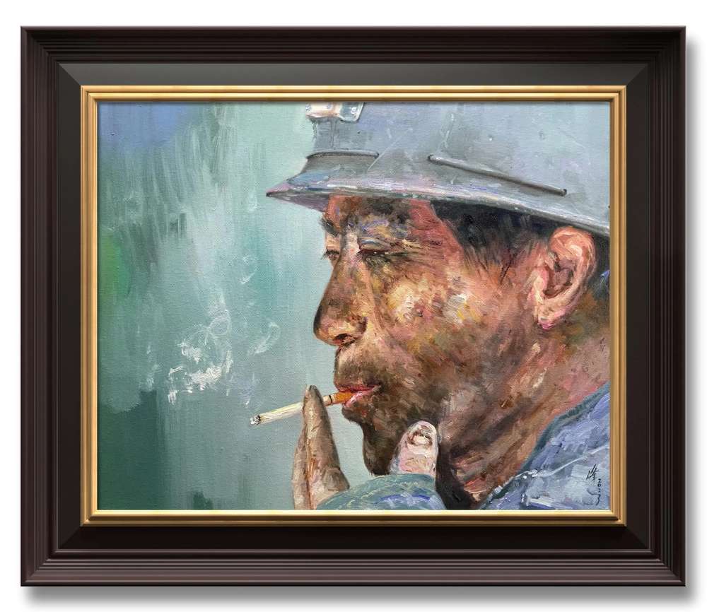 《吸烟的矿工》布面油画 作品材质:专业亚麻油画布,高级油画颜料绘制百年不变色可收藏升值 画芯尺寸:40*50CM,收藏级精品, 2023最新风歌梁峰(专注油画25载)原作纯手绘保真 特价放漏来袭,先抢先得,孤品唯一错过不再有识货的来