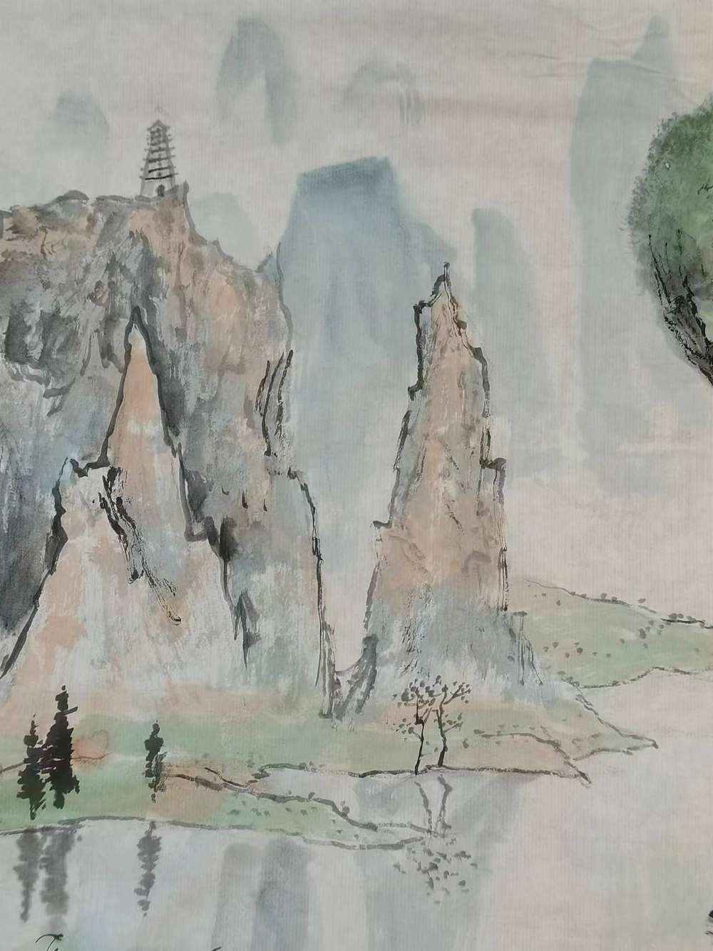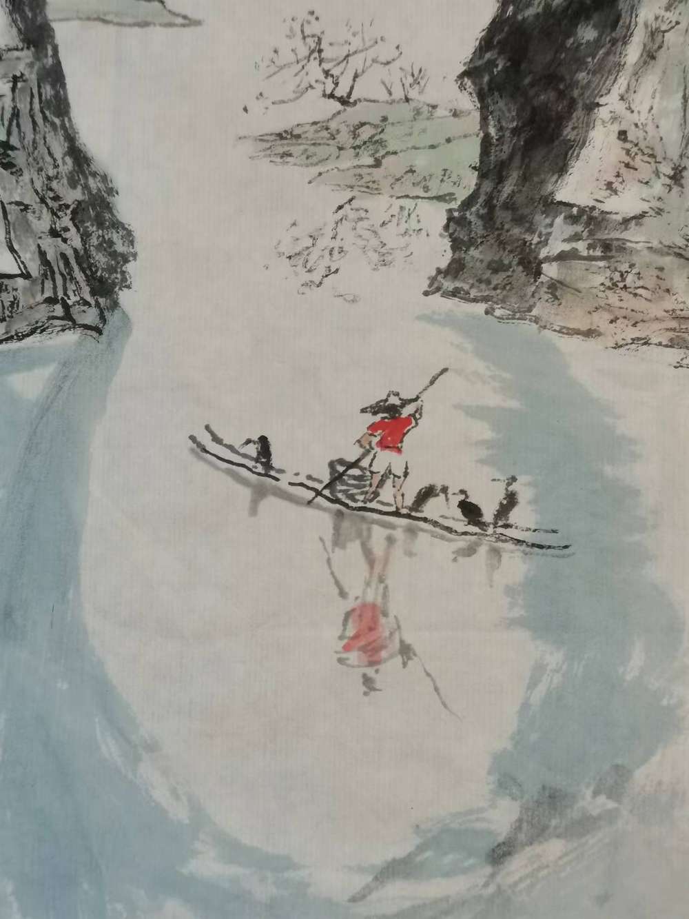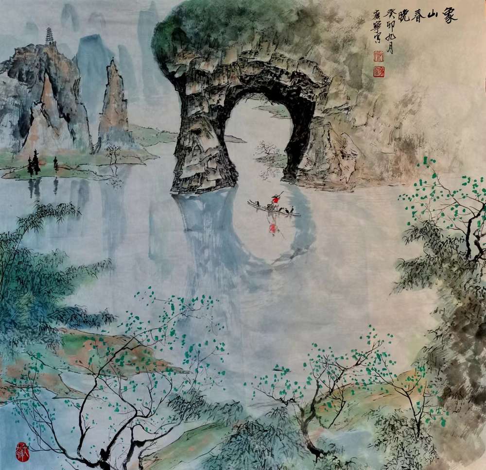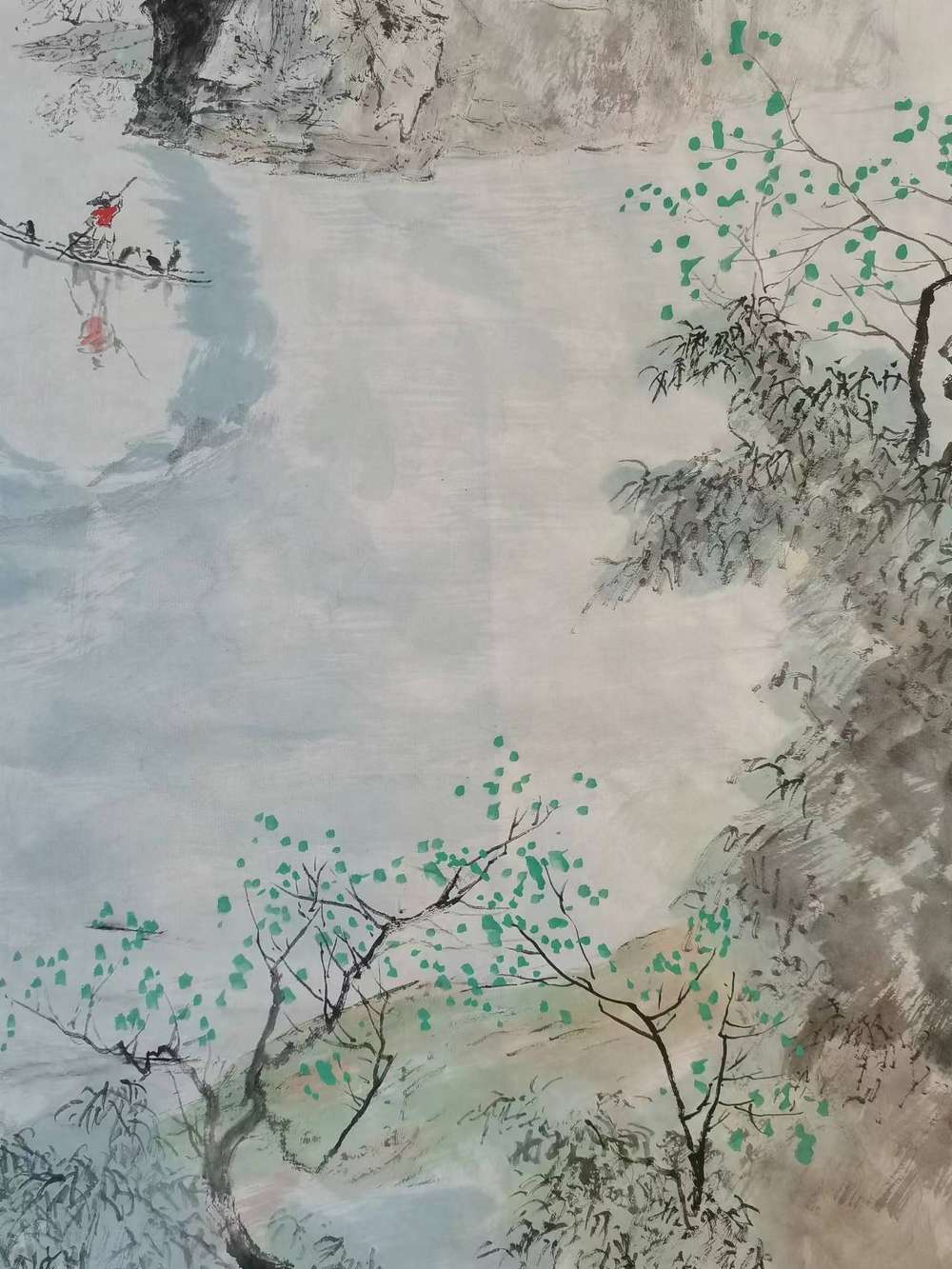作者早年师承于李苦禅大师的得意弟子李松林老师,作品笔墨苍劲有力,构图险绝严谨,作者亲自到桂林写生体验生活数月,对漓江山水有独特的理解和表达,用沉稳老辣的笔墨画出独特的漓江山水